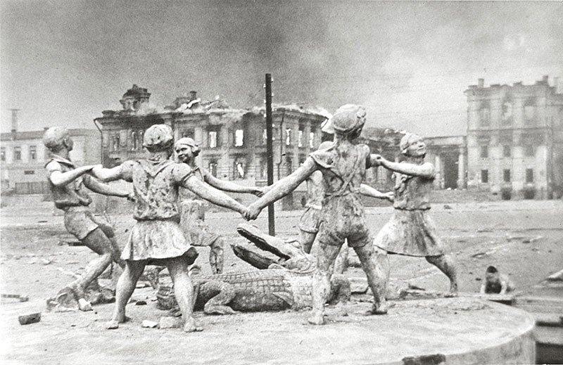 La imagen de la fuente Barmaley de Stalingrado tomada por Evzerikhin en 1942 representa como ninguna otra la tragedia de la ciudad bombardeada. Sus niños danzantes entre las llamas, como si fuesen ajenos a la destrucción que les rodea, simbolizan a una infancia que sobreviviría a la batalla más decisiva de la guerra, aunque muchos dejasen allí la vida.