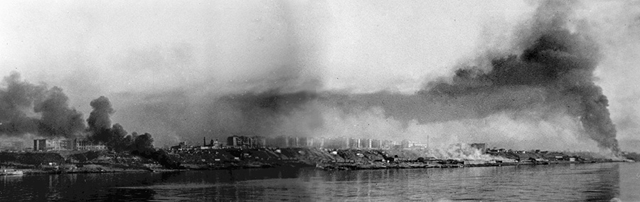 Vista panorámica de la ciudad desde el otro lado del Volga durante los bombardeos del 24 de agosto de 1942 (RIA Novosti).