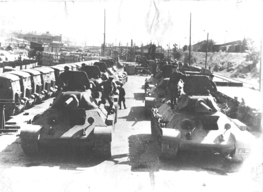 Agosto de 1942, fábrica de tractores de Stalingrado. Tanques T-34 preparados para partir al frente, que ya está muy cerca de la ciudad. En ese momento trabajaban allí algunos muchachos, que completaban sus estudios en ramiesli, quienes cubrían turnos de doce horas para atender la urgente necesidad de blindados del Ejército Rojo (www.rostec.ru).