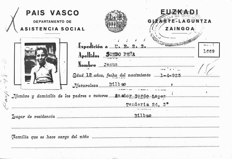 Ficha de evacuación a la URSS de Jesús Sordo emitida por el departamento de asistencia social del Gobierno Vasco (vía José Antonio Soto).